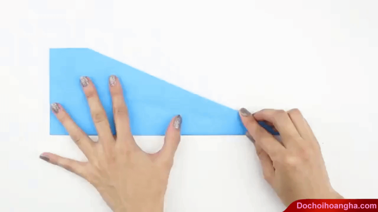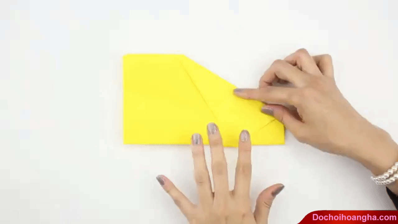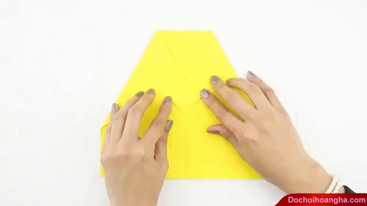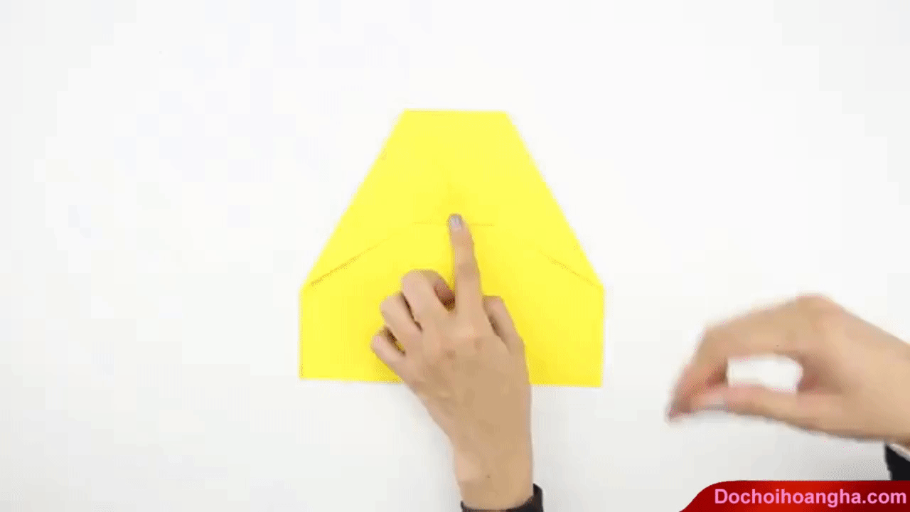 Đừng để đỉnh nhọn chạm đến mép dưới của tờ giấy, vì khi đó cấu trúc của máy bay bị thay đổi sau khi gấp xong.